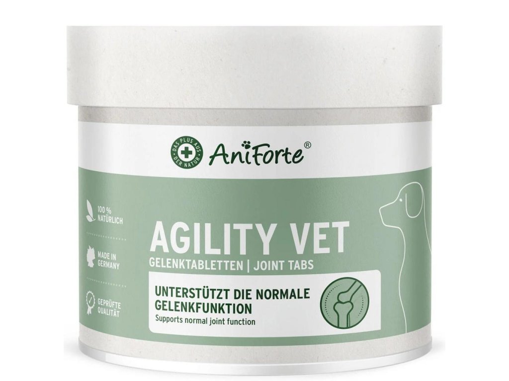 Kloubní tablety pro psy AniForte® AgilityVET mohou psy podporovat přirozenou cestou prostřednictvím optimálního přísunu obsažených surovin, jako je kolagen a ďábelský dráp.