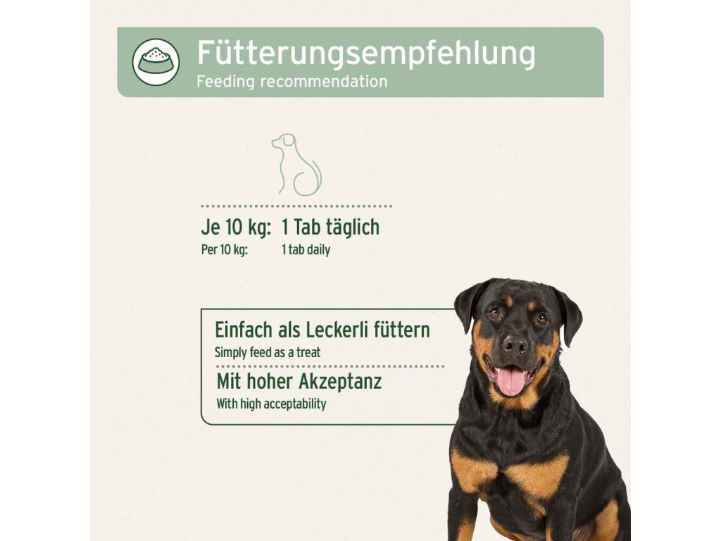 Kloubní tablety pro psy jsou vysoce akceptovány a lze je snadno krmit jako pamlsek. Pro malé psy lze tablety pro snadnější krmení také rozdělit napůl. V případě potřeby lze denní doporučení krmení také zdvojnásobit.