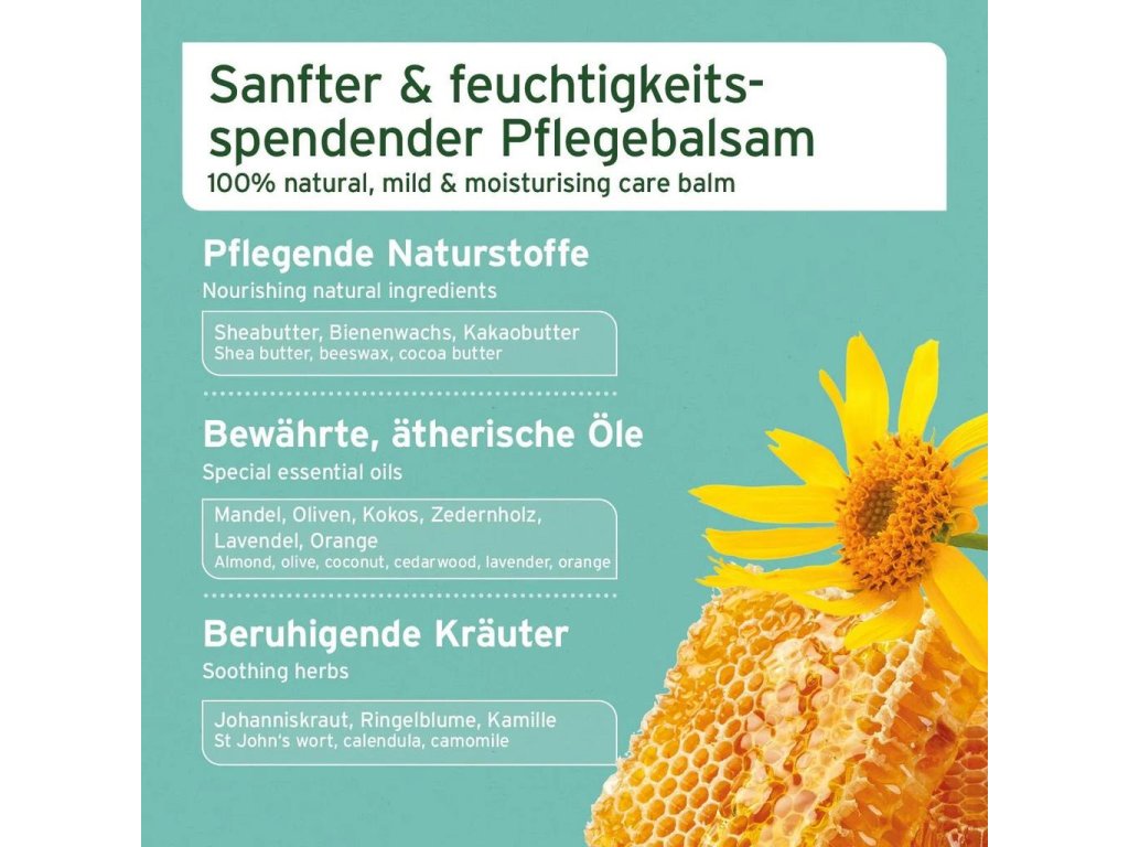 Bambucké máslo 25 %, včelí vosk 20 %, mandlový olej 15 %, olivový olej, kokosový olej, avokádový olej, kakaové máslo, ricinový olej, třezalková esence, měsíček lékařský, kostival lékařský (symphytum), heřmánek, éterické oleje ( cedrové dřevo, cypřiš, levandule, pomeranč)