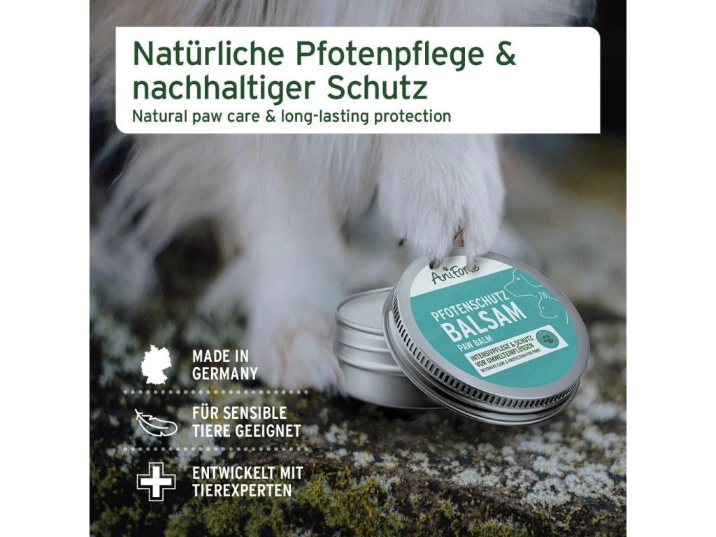 AniForte® Paw Protection Balm – přirozená ochrana tlapek psů a koček. Naše speciální složení poskytuje citlivým polštářkům tlapek intenzivní vlhkost a šetrně o ně pečuje pomocí vybrané směsi přírodních složek.