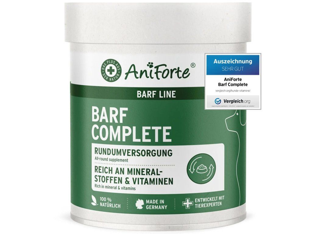 Zejména syrové krmení vyžaduje od majitelů velké množství znalostí. BARF (biologicky vhodné syrové krmivo) pro psy se skládá především ze syrového masa, drobů, kostí a ryb, doplněných čerstvým ovocem a zeleninou. Pokud majitel nemá dostatečné znalosti o nutričních potřebách psa, hrozí mu podvýživa. AniForte® BARF Complete je vyvážený BARF doplněk stravy ve formě prášku vyrobený z cenných přírodních ingrediencí, který přirozeně podporuje vitamínovou a minerální rovnováhu vašeho mazlíčka.