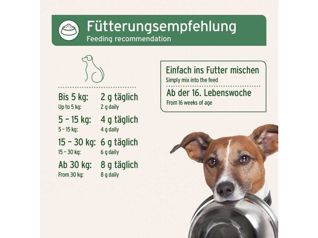 Snadno dávkovatelné jemné granule lze jednoduše vmíchat do denního krmiva vašeho psa. Náš doplněk stravy BARF v prášku byl vyvinut nejen s ohledem na zdraví, ale také pro potěšení psích chuťových pohárků. Díky své bezkonkurenční svěží bylinné chuti se náš produkt těší vysoké chutnosti.