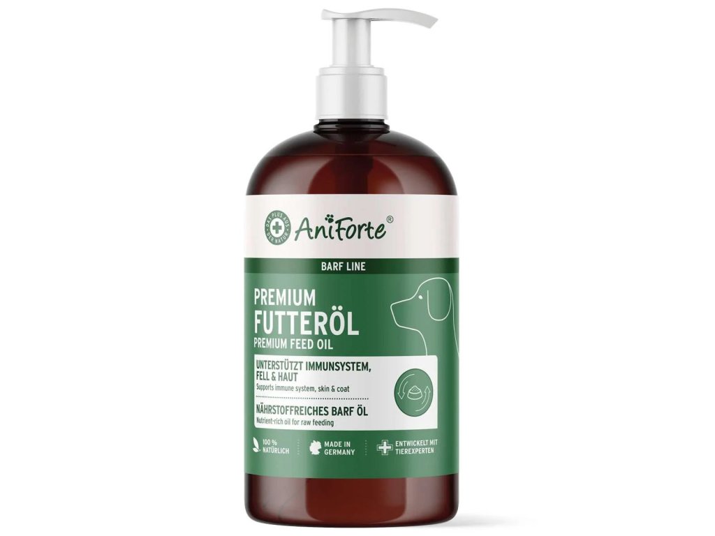 Krmný olej AniForte® Premium se skládá z kombinace přírodních rostlinných a základových olejů, které vašemu čtyřnohému příteli dodají důležité mastné kyseliny a životně důležité látky. Omega-3 a omega-6 mastné kyseliny podporují buněčný metabolismus a imunitní systém tím, že tvoří tělu vlastní obranné buňky. Zdraví podporující omega-6 mastné kyseliny také udržují přirozenou stabilitu membrány a mohou tak zachovat přirozenou srst a kůži. Bohaté krmné oleje jsou stravitelnými zdroji energie a přispívají k vyvážené stravě vašeho mazlíčka.