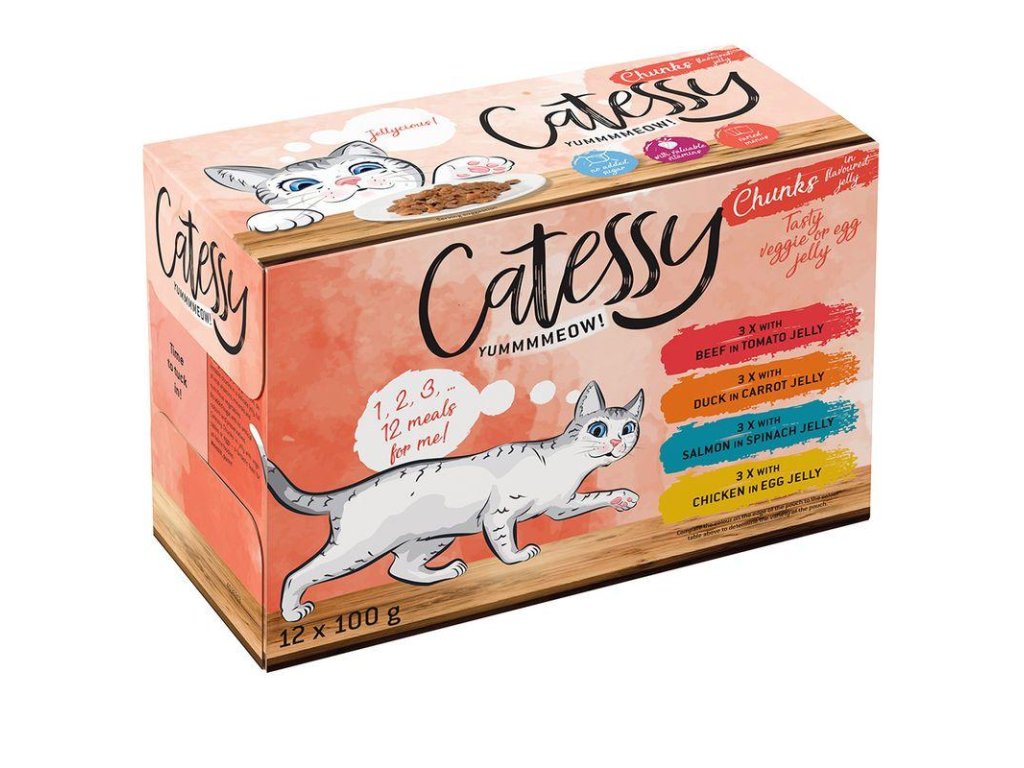 Krmivo Catessy kousky v želé s míchanou zeleninou přináší Vašemu tygříkovi gurmánský zážitek. Velké kousky masa a ryby ve šťavnatém želé se zeleninou a vejcem nadchnou svou chutí každou kočku. Různorodost stravy zajišťují čtyři různé příchutě v balení. Kapsičky jsou s lahodným hovězím masem, gurmánskou kachnou, jemným lososem nebo se šťavnatým kuřecím masem jsou doplněny zdravou zeleninou. Želé obsahuje buď rajčata, která zrála na slunci, zdravou mrkev, šťavnatý špenát nebo vydatné vejce, tato kombinace zajišťuje gurmánský zážitek. Šťavnaté želé pokrývá část denní potřeby tekutin. Kapsičky Catessy jsou jemně uzené, díky tomu jsou zachovány kvalitní ingredience a lahodná chuť. Kapsičky dávají Vašemu tygříkovi důležité minerály a vitamíny, které jsou nezbytné pro zdraví Vaší kočky. Kapsičky jsou vyrobené v Německu a neosahují přidaný cukr a konzervační látky a obilí. Míchané balení 12 kapsiček po100 g se skládá ze čtyř lahodných variant.