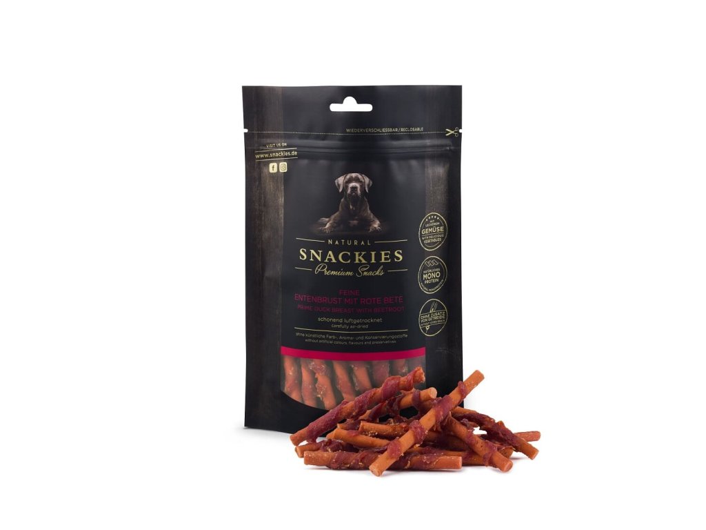 Kachní prsa s červenou řepou: 52 % kachní prsa, 25 % červená řepa, hrachový protein, bramborový škrob, přírodní rostlinný glycerin, minerály