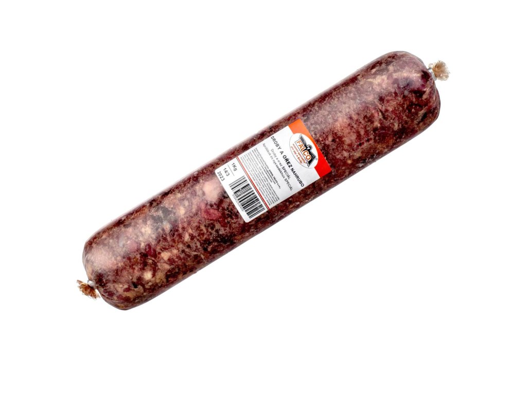 Mletá směs z drobů a hovězího ořezu. Vysoký podíl sodíku i hořčíku v přírodní formě. Vše obsažené v cca 1kg balení. Salám je balen ve varném střevě, proto je možné vařit i s obalem