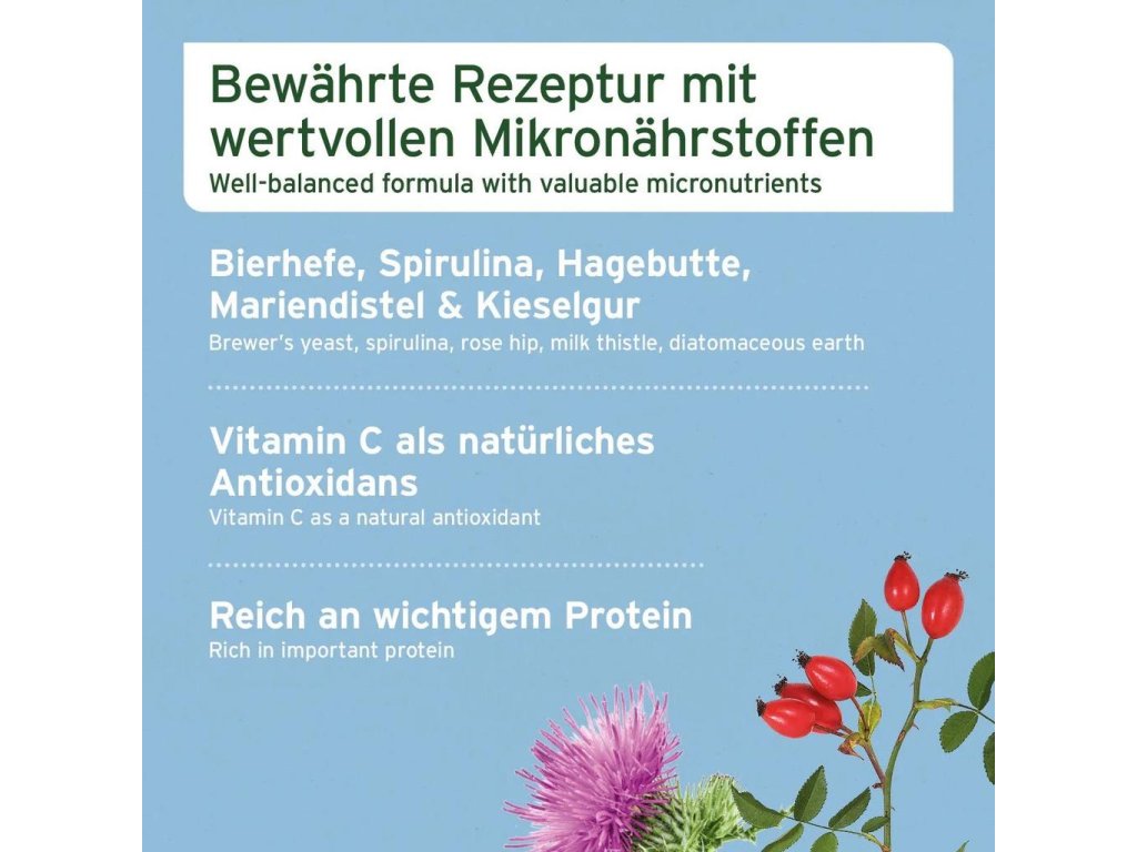 50 % mleté pivovarské kvasnice, 10 % mletá spirulina* (60 % bílkovin), 5 % mleté skořápky šípku (0,13 % vitamin C), hrubě mletá semena ostropestřce mariánského
