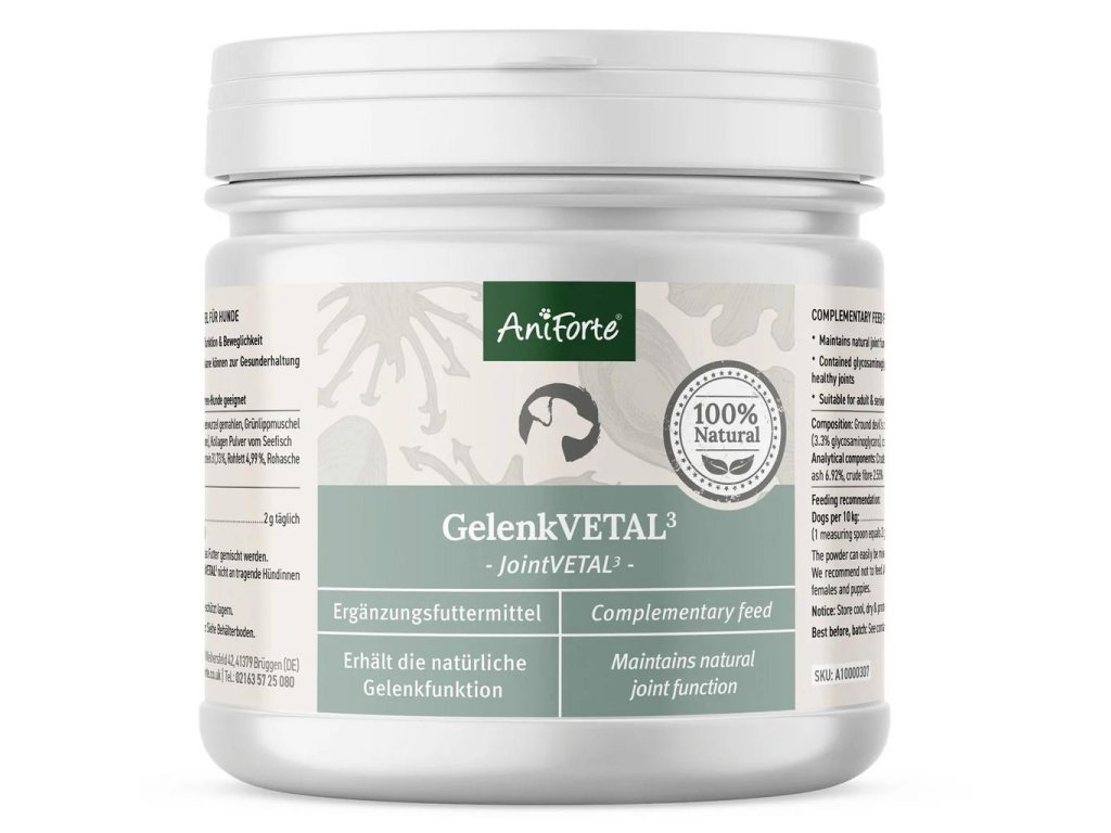 AniForte® JointVETAL 3 prášek na klouby pro psy je opravdovou silovou směsí 3 tradičních přírodních ingrediencí . O těchto pozitivních vlastnostech je po staletí známo, že podporují pohybový aparát . Precizně sladěná kombinace novozélandské mušle zelené, drápu afrického ďábla a kolagenu z bílé ryby optimálně přispívá k péči o klouby a podporuje radost z pohybu vašeho čtyřnohého přítele.