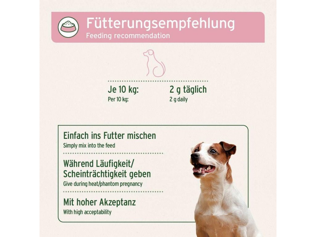 Byliny byly záměrně vybrány tak, aby se vzájemně posilovaly: Fytohormony regulují vylučování prolaktinu, zatímco adaptogeny a uklidňující rostlinné extrakty mohou snižovat stres. Tato pečlivě vyvážená a jedinečná směs v práškové formě nabízí přirozenou podporu při hormonální nerovnováze. Receptura může jemně doprovázet vaši fenu, zejména během říje nebo během falešné březosti s nežádoucím chováním. Směs je ideální jako denní doplněk vyvážené stravy.