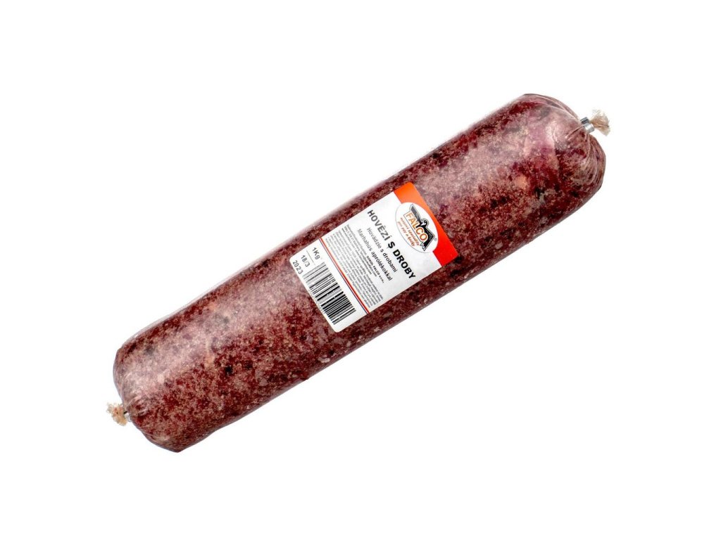 Mletá směs z drobů, hovězího ořezu a podílu kostí, chrupavek i dalších vedlejších živočišných produktů. Vše obsažené v cca 1kg balení. Salám je balen ve varném střevě, proto je možné vařit i s obalem nebo použít jako syrovou směs.