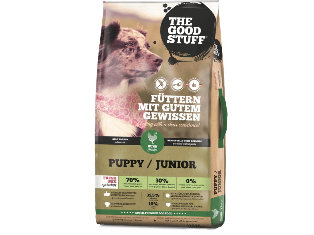 The Goodstuff puppy & junior je superprémiové kompletní krmivo pro psy všech plemen až do 14 měsíců věku. Neobsahuje obilí, je bohaté na čerstvou kuřecí a krůtí svalovinu, amarant s nízkým glykemickým indexem, lokální ovoce a zeleninu a vybrané byliny. Optimální obsah bílkovin a snížený obsah tuku má zajistit zdravý růst a zároveň zabránit nepřirozeně rychlému růstu.