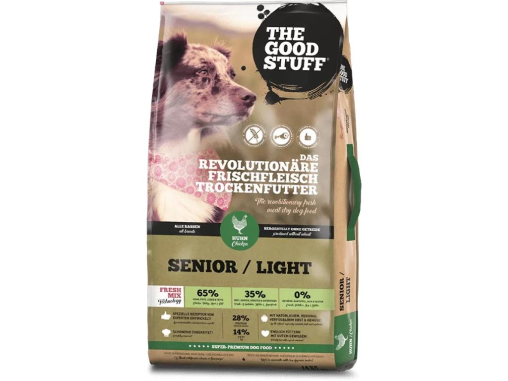 The Goodstuff Senior/Light Chicken & Turkey se 65% čerstvého kuřete a krůty je superprémiové kompletní krmivo pro starší psy s normální úrovní aktivity stejně jako pro psy s nízkou aktivitou všech plemen a velikostí. Neobsahuje obilí, je bohaté na čerstvou kuřecí a krůtí svalovinu v potravinářské kvalitě, amarant s nízkým glykemickým indexem, lokální ovoce a zeleninu a vybrané byliny. Obsahuje glukosamin a chondroitin z přírodních zdrojů (kuřecí chrupavky a korýši) na podporu zdravých kloubů. Výjimečná receptura ve spojení s novou, unikátní, obzvláště šetrnou metodou výroby přinese vašemu psovi mimořádný zážitek plný vůně a přírodní chuti!