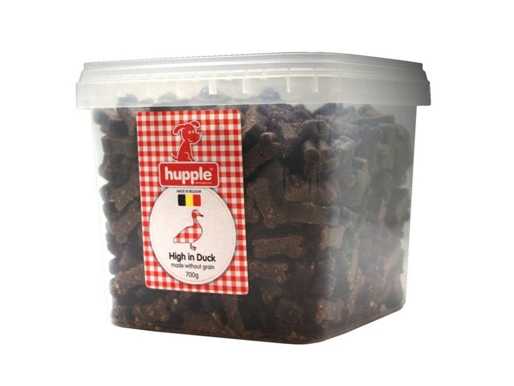 Belgické psí pralinky Hupple s vysokým obsahem masa obsahují 70 % kachního. Nová řada je navíc vyráběna bez přidání obilovin, je tedy ideální pro citlivé psy. Pamlsky jsou vyrobeny na bázi bramborového škrobu.