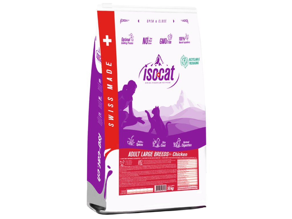 Iso-cat ADULT Large Breeds Chicken je superprémiové krmivo pečlivě vyrobeno speciálně pro dospělé kočky velkých plemen.