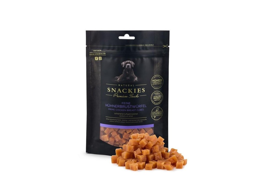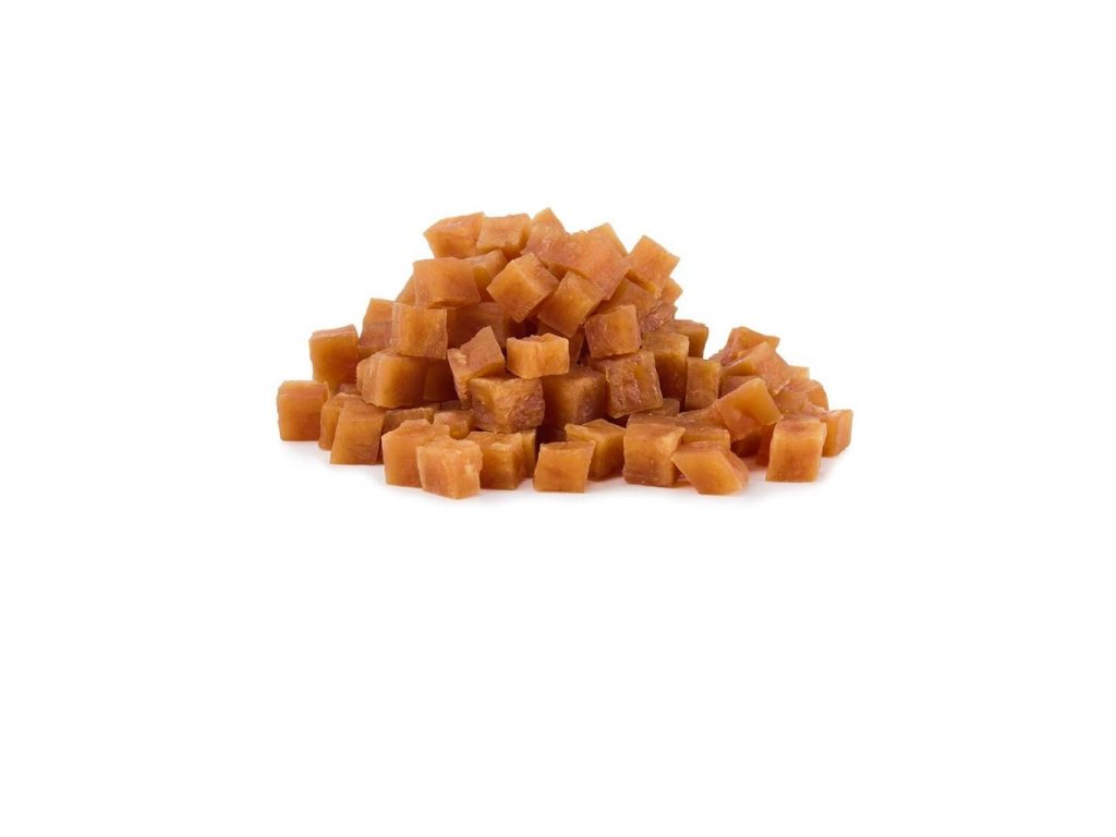 Jemné, na vzduchu šetrně sušené kostky kuřecích prsou. S nízkým obsahem tuku, bez přidaných umělých barviv, příchutí nebo konzervačních látek a bez přidaného cukru nebo obilí.