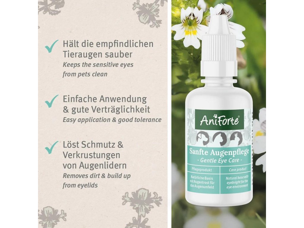 AniForte® Gentle Eye Care je zvláště jemný čisticí prostředek pro citlivé oční okolí zvířat. Naše speciální složení s přírodními složkami světlíku chrání oční víčka a okraje víček před kontaminací, krustami a sekrety, aniž by dráždily citlivé oči zvířat.