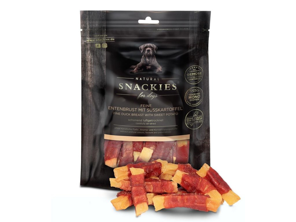 Jemná, na vzduchu šetrně sušená kachní prsa s batátem s nízkým obsahem tuku, bez přidání umělých barviv, aromat či konzervantů a bez přidaného cukru či obilí.