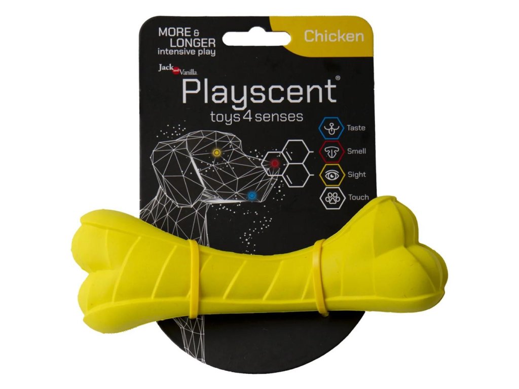 Gumová žvýkací kost s vůní kuřecího masa. Jack and Vanilla Playscent gumová kost - Chicken (kuřecí) je ideální pro kousání a interaktivní hry, vyrobená z odolných materiálů pro dlouhotrvající zábavu.