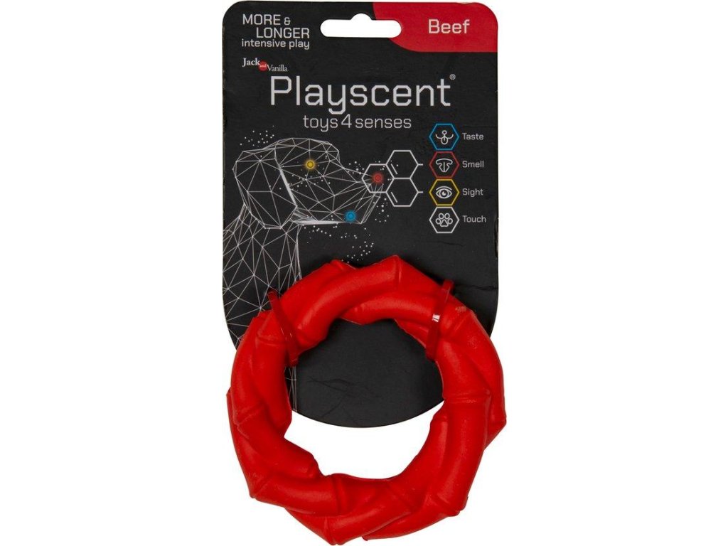 Gumový žvýkací kroužek s vůní hovězího masa. Jack and Vanilla Playscent Ring - Beef (hovězí) je ideální pro kousání a interaktivní hry, vyrobená z odolných materiálů pro dlouhotrvající zábavu.