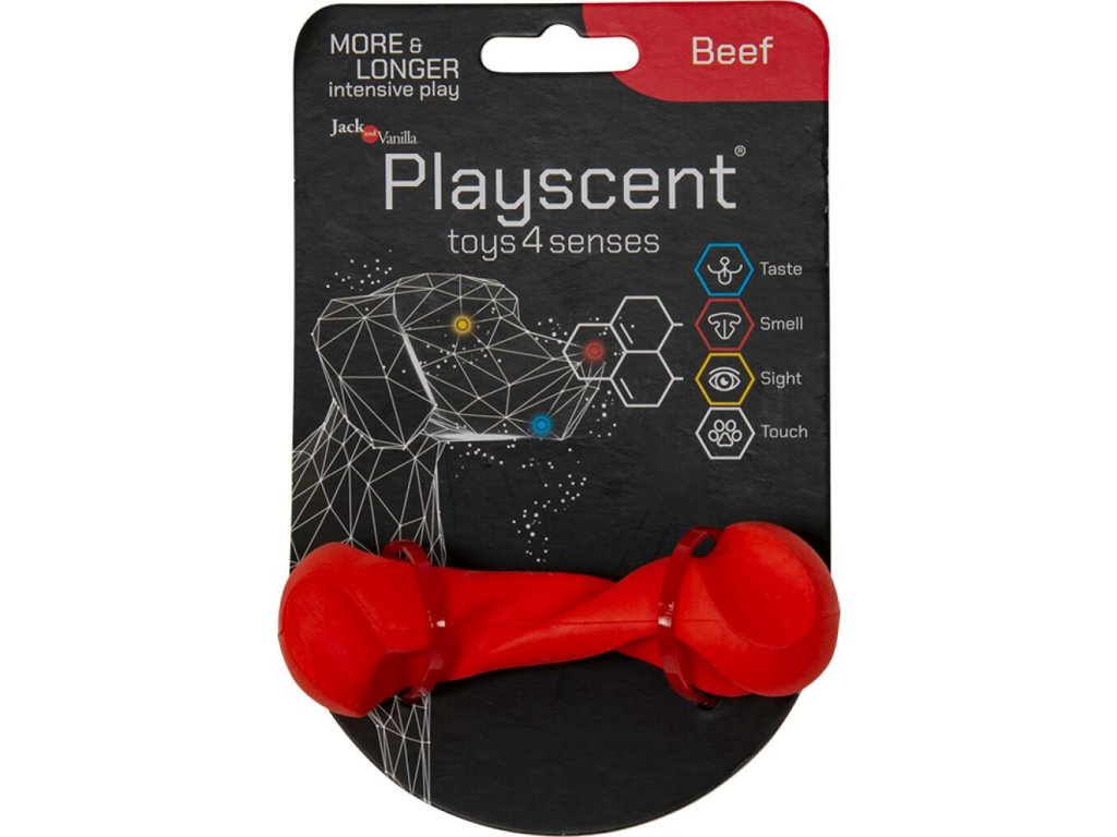 Chutná hračka pro psy s vůní hovězího maso! Jack and Vanilla Playscent kroucená kost - Beef (hovězí maso) je ideální pro kousání a interaktivní hry, vyrobená z odolných materiálů pro dlouhotrvající zábavu.
