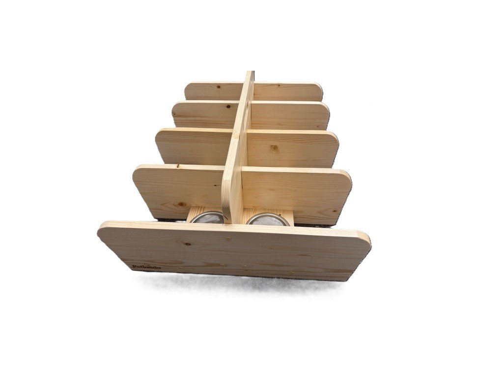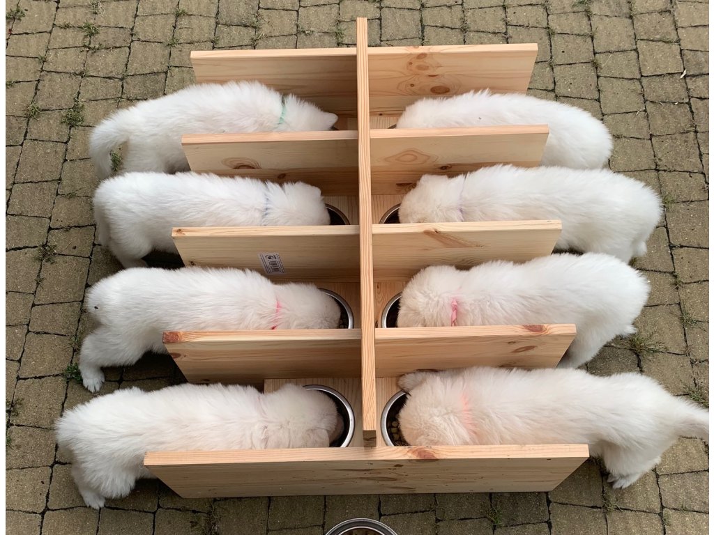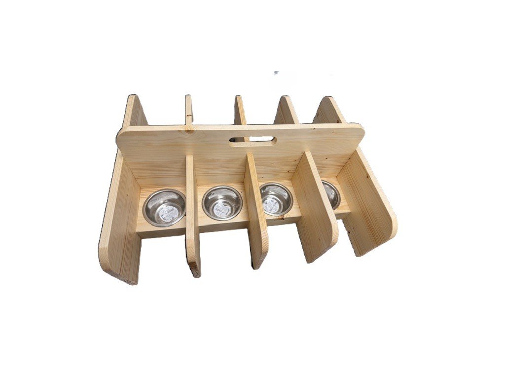 Představujeme chovatelskou kolektivní misku pro 8 štěňat a je opatřena přepážkami. Přepážky zajistí, že každé ze štěňat dostane svou předepsanou denní dávku krmiva a zabrání vzájemné konkurenci při krmení. Krmítko je i dobrou socializací při společném krmení. Vše je dobře omyvatelné k udržení hygieny a díky praktickému úchytu v horní části se celé krmítko dobře přenáší. Díky masivnímu dřevu, je krmítko stabilní a nepřevrátí se. Odzkoušeno chovateli a při správné údržbě vydrží spoustu let.