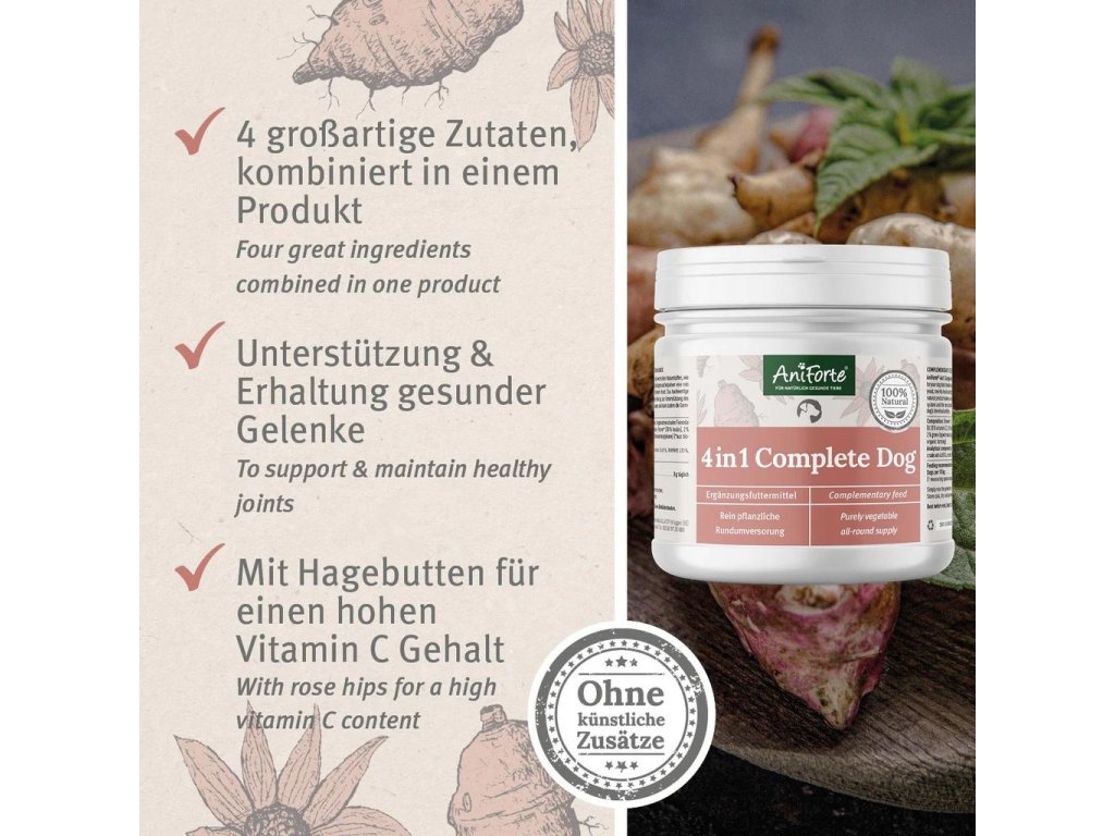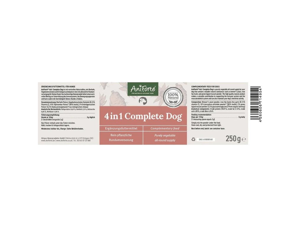 AniForte® 4v1 Complete Dog je vyroben podle nejvyšších požadavků na kvalitu a lze jej snadno přimíchat do každodenního jídla vašeho čtyřnohého přítele. Ideální a trvale zaručené je tímto způsobem posílení imunitního systému psa.