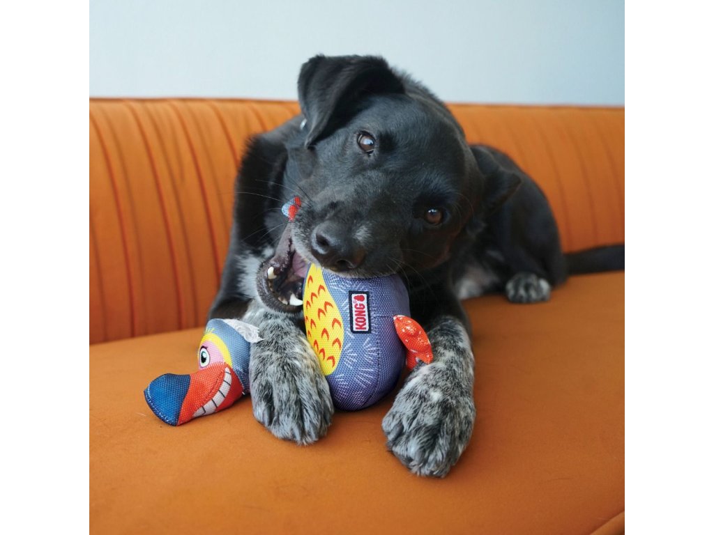 Mávající nohy a křídla jsou ideální pro třepání, zatímco zábavná směs textur dodává tomuto rozkošnému kamarádovi vzrušení, kterého si psi všech velikostí mohou chytit za krk a hrát si s ním. Kulaté textury dodávají vzrušení. Pískadlo prodlužuje zábavu. Odolný balistický materiál Kong vydrží i drsnější hru.
