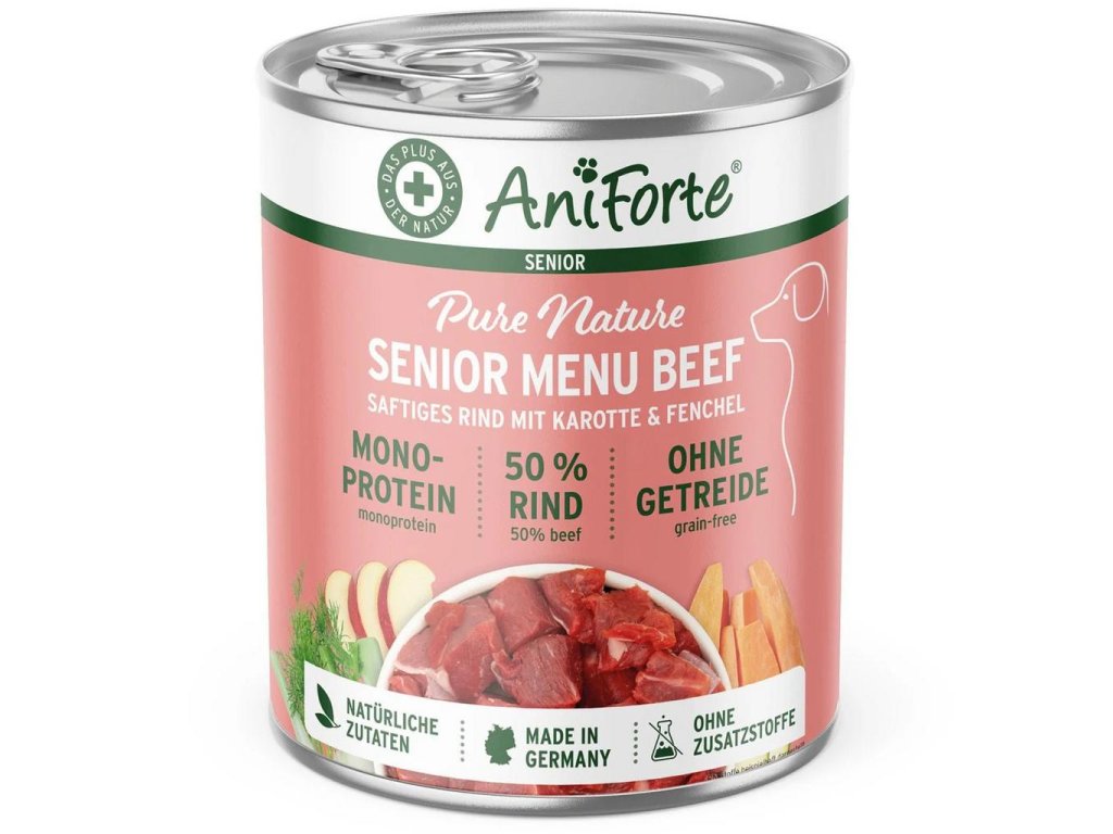 Mokré hovězí maso AniForte® Senior je vysoce kvalitní prémiové krmivo pro psy sestávající z hovězího masa, mrkve a brambor. Spolu s fenyklem a jablkem vykouzlí pro vašeho psa chutné jídlo.