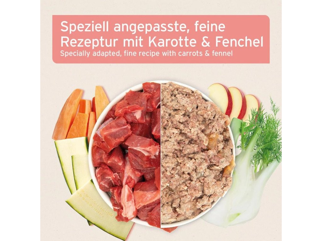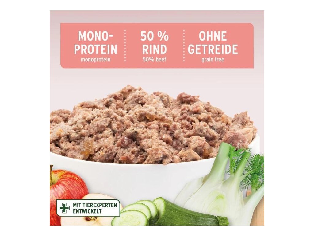 50 % hovězí maso (skládající se ze svaloviny, srdce, játra, plíce, vemeno, dršťky) plus 25,2 % vývar, 10,0 % mrkev, 7,0 % brambor, 3,0 % cuketa, 2,0 % fenykl, 2,0 % jablko, 0,1 % prášek ze skořápky, 1% prášek ze skořápky, 0,1 % mušle. ginkgo), 0,1 % řepkový olej, 0,1 % spirulina, 0,1 % oxid křemičitý, 0,1 % limetka z mořských řas, 0,1 % omega-3 extrakt
