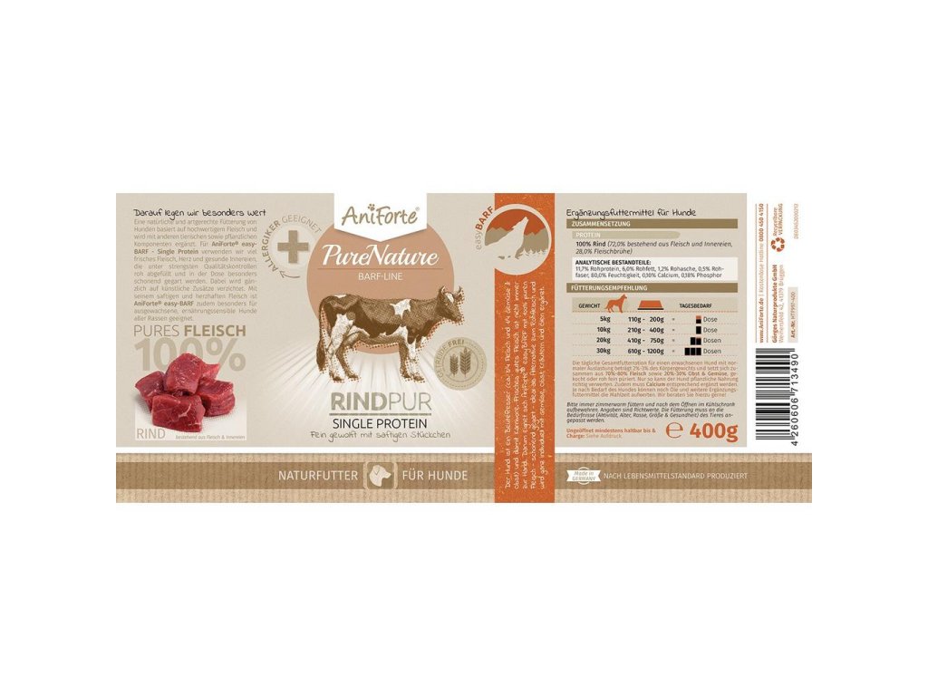 Díky jedinému proteinu, který obsahuje, je AniForte® Pure Nature Pure Meat perfektní volbou pro nutričně citlivé psy všech věkových kategorií a plemen. Pro vyváženou a optimální stravu přizpůsobenou zvířeti by měla být obohacena o zeleninu, ovoce, vápník, olej a další přísady.