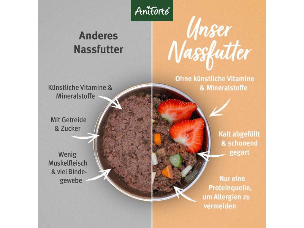 Mokré krmivo AniForte® PureNature je vysoce kvalitní jednoproteinové kompletní krmivo pro psy v superprémiové kvalitě - vyrobené v Německu podle potravinářských norem. Tajemstvím naší kvality je velké množství čerstvého a kvalitního masa, které pro AniForte® PureNature používáme. Dbáme na vysokou kvalitu našich surovin a podrobujeme je pravidelným veterinárním kontrolám! Samotná kontrola však není jedinou zárukou našich vysokých standardů kvality: maso a další ingredience získáváme téměř výhradně od výrobců, s nimiž spolupracujeme již léta v duchu důvěry. Suroviny jsou zpracovány co nejrychleji, aby byla zachována jejich čerstvost a přirozené vitamíny. Tímto způsobem jsou všechny cenné suroviny téměř zcela zachovány - tak zajistíme vyváženou stravu a navíc to obzvlášť chutná.