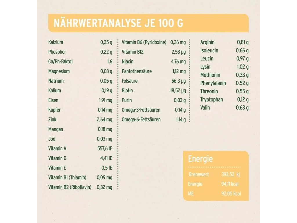 10,7 % hrubého proteinu, 6,4 % hrubého tuku, 2,0 % hrubého popela, 0,5 % hrubé vlákniny, 76,0 % vlhkosti