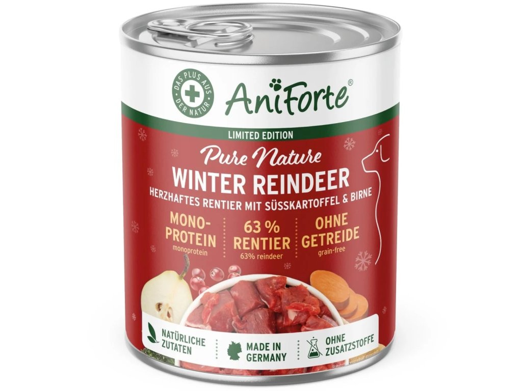 Dobré zdraví a pohoda psů začíná také dobrým žaludkem – zejména v chladném období je pro vašeho psa obzvláště důležitá speciálně přizpůsobená a na živiny bohatá strava. Proto jsme se rozhodli vyvinout AniForte® Pure Nature Winter Reindeer , přírodní mokré krmivo, které vašeho čtyřnohého přítele nejen vyživí, ale také mu dodá novou energii.