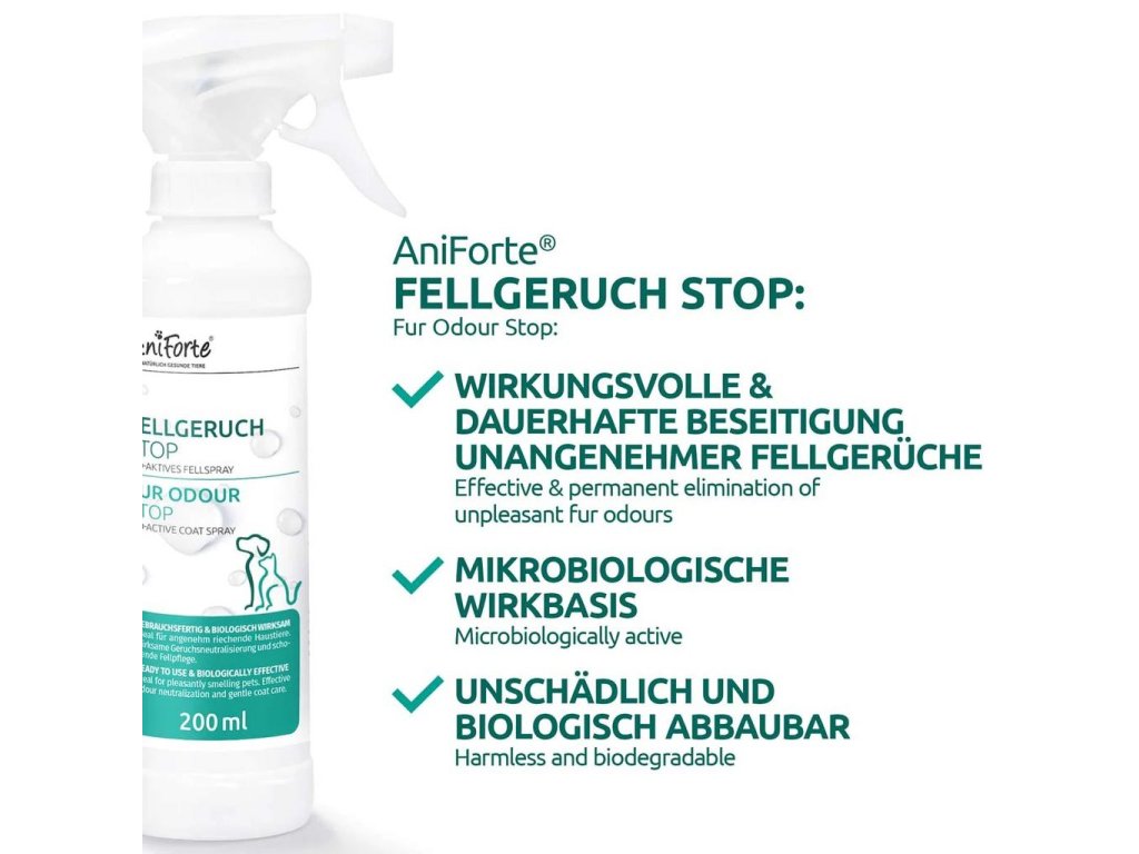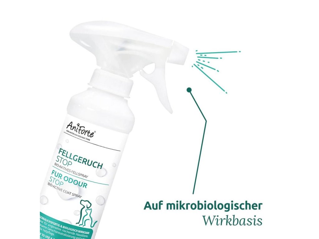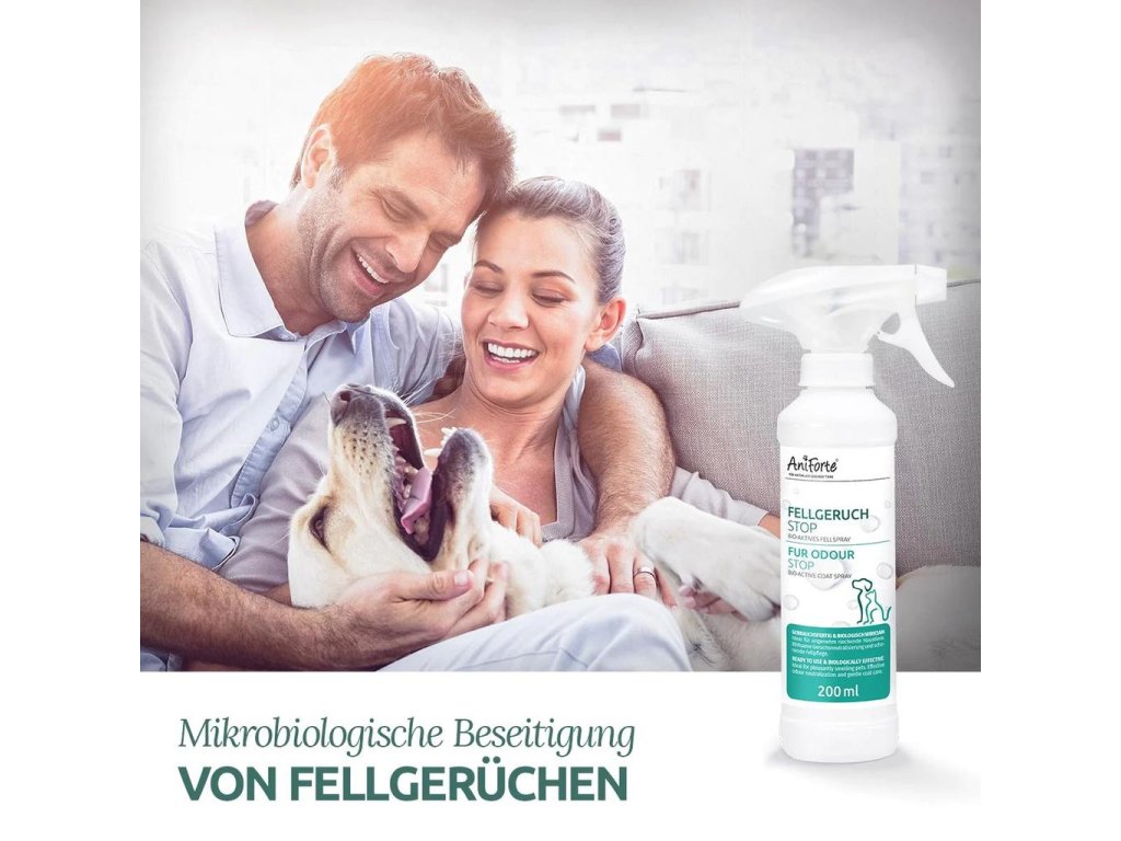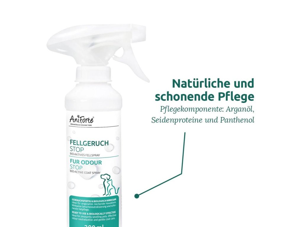 Sprej na srst AniForte® STOP proti zápachu srsti má hluboký účinek prostřednictvím mikroorganismů, které bojují s nepříjemnými pachy a rozkládají je přímo u základny. To nejen překryje zápach, ale zcela jej neutralizuje. Pes už výrazně nevoní a majitelé koček mají radost z voňavé kočičí srsti. Díky jemným pečujícím složkám v podobě arganového oleje, hedvábných proteinů a panthenolu je aplikace vhodná pro všechny typy srsti a kůže – i pro zvláště citlivá zvířata.