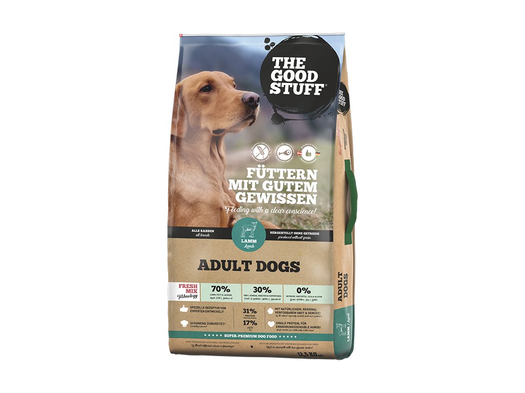 The Goodstuff Adult Lamb je monoproteinové bezobilné (grain free) krmivo nejvyšší kvality z jehněčího masa vhodné pro dospělé psy všech plemen a velikostí. Jehněčí maso je obzvláště chutné a vysoce stravitelné, s nízkým obsahem tuku a bohaté na na cenné vitamíny a živiny. Granule The Goodstuff jsou vyrobeny novou šetrnou FRESH-MIX metodou, jsou bohaté na čerstvou jehněčí svalovinu v potravinářské kvalitě, amarant s nízkým glykemickým indexem, regionálně dostupné ovoce a zeleninu a vybrané bylinky. Neobsahují chemické konzervační látky, umělá barviva, aromata ani přidaný cukr.