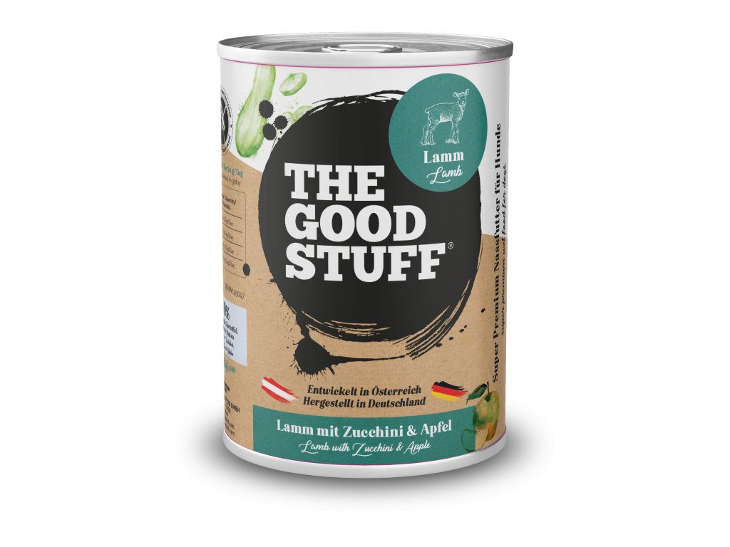 Jehněčí s cuketou a jablkem je bezobilné jednoproteinové mokré krmivo v osvědčené superprémiové kvalitě od THE GOODSTUFF. Jehněčí maso je obzvláště chutné, s nízkým obsahem tuku a bohaté na cenné vitamíny a živiny. Naše mokré krmivo pro psy je šetrně uvařeno, obsahuje 70 % čerstvé jehněčí svaloviny a vysoce kvalitní droby od regionálních dodavatelů nejvyšší kvality, rafinované regionálně dostupným ovocem a zeleninou, stejně jako vybranými bylinkami a lněným olejem. Jehněčí s cuketou a jablkem je kompletní krmivo pro psy všech plemen a velikostí.