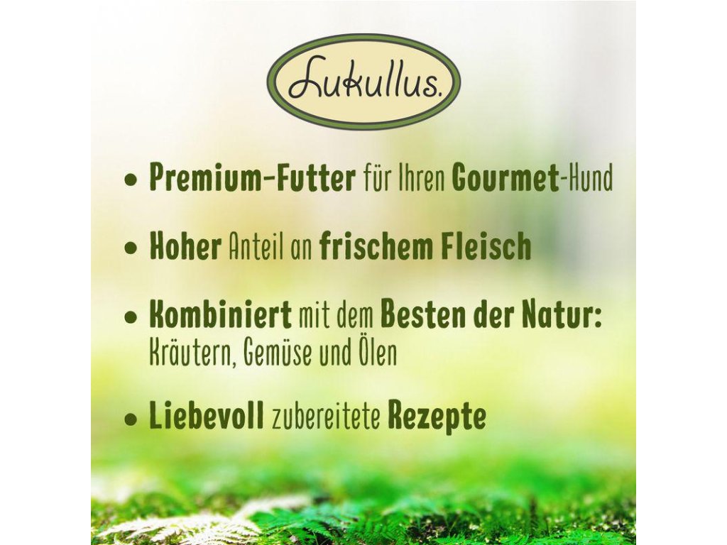 Lukullus krmivo pro psy je založeno na velmi bohaté receptuře. Kombinace živočišných bílkovin, rostlinných složek a cenných olejů zásobuje Vašeho psa všemi živinami, naprosto bez chemických přísad. Protože příroda obsahuje všechno, co Váš pes potřebuje.