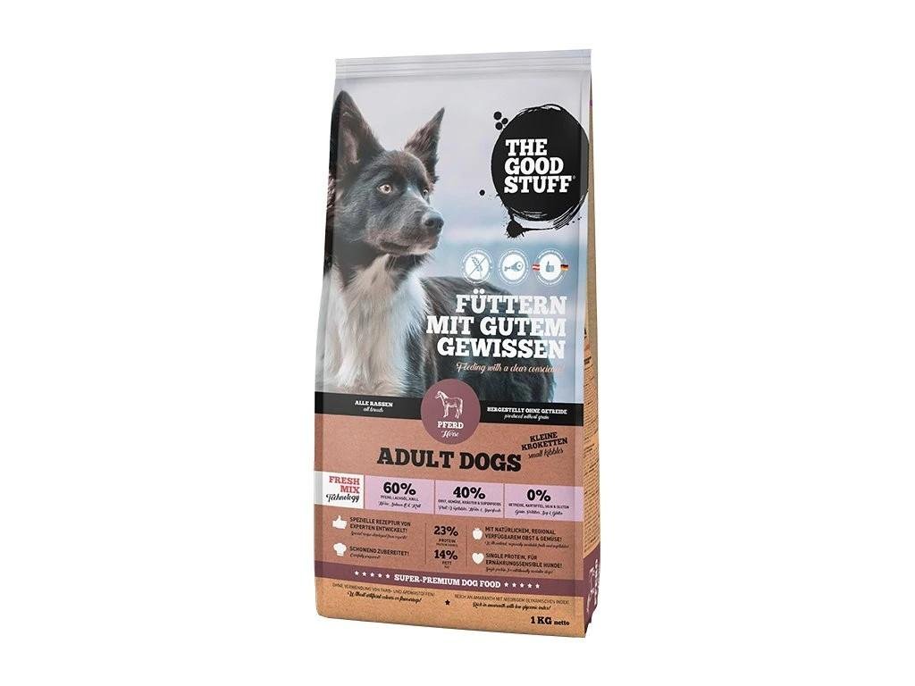 The Goodstuff Adult Horse je revoluční superprémiové kompletní krmivo pro dospělé psy všech plemen a velikostí. Granule jsou vyrobeny novou FRESH-MIX metodou bez obilí. Koňské maso je hypoalergenní, a proto je zvláště dobře tolerováno citlivými psy. Pečlivě vyrobené bez obilovin, bohaté na čerstvou koňskou svalovinu, regionálně dostupné ovoce a zeleninu, vybrané bylinky a vysoce kvalitní omega-6 a omega-3 mastné kyseliny z přírodních zdrojů, jako je krill a slunečnicový olej.