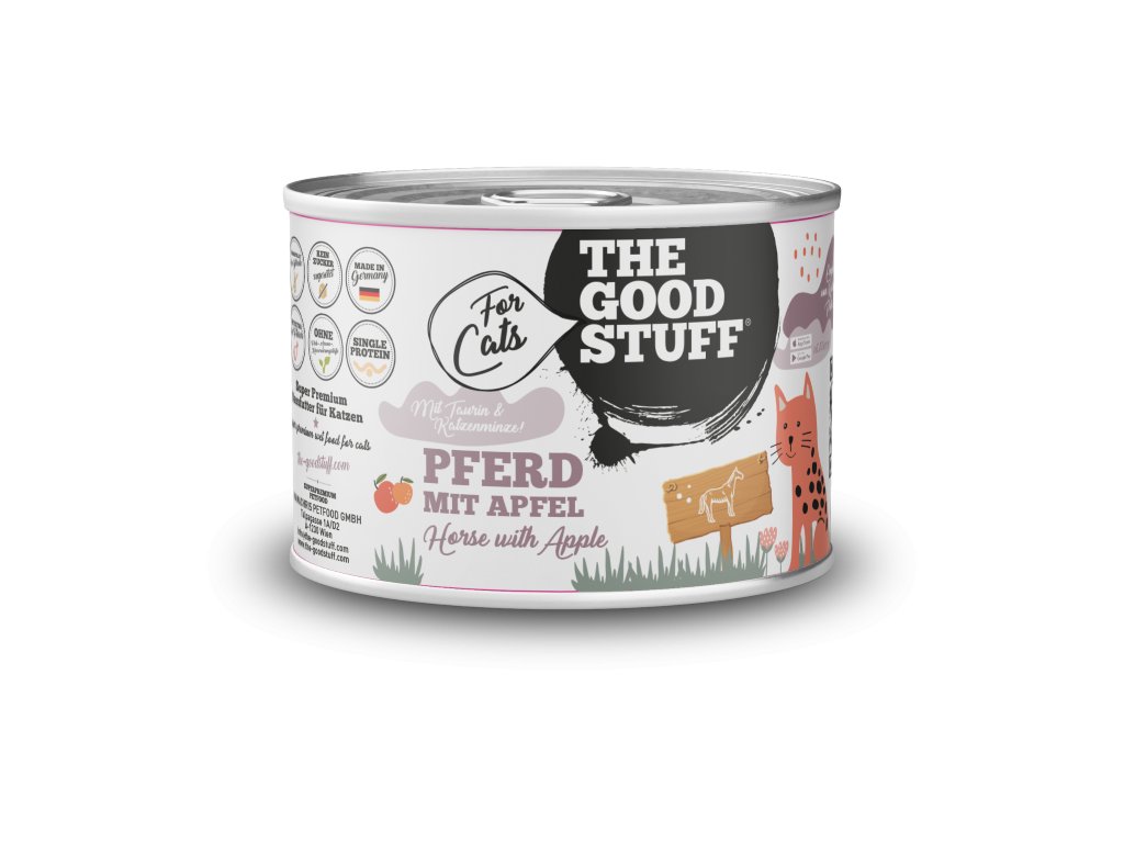 Koňské maso s jablkem - je bezobilné jednoproteinové mokré krmivo v osvědčené superprémiové kvalitě od THE GOODSTUFF For Cats. Koňské maso je velmi snadno stravitelné, s nízkým obsahem tuku, bohaté na cenné vitamíny a živiny a ideální pro nutričně citlivé kočky. Naše mokré krmivo pro kočky je šetrně uvařené, obsahuje 70 % čerstvé koňské svaloviny a vysoce kvalitní droby od regionálních dodavatelů té nejlepší kvality, rafinované regionálně dostupným ovocem, stejně jako taurinem a catnipem. „HORSE with APPLE“ je kompletní krmivo pro kočky všech plemen a velikostí.