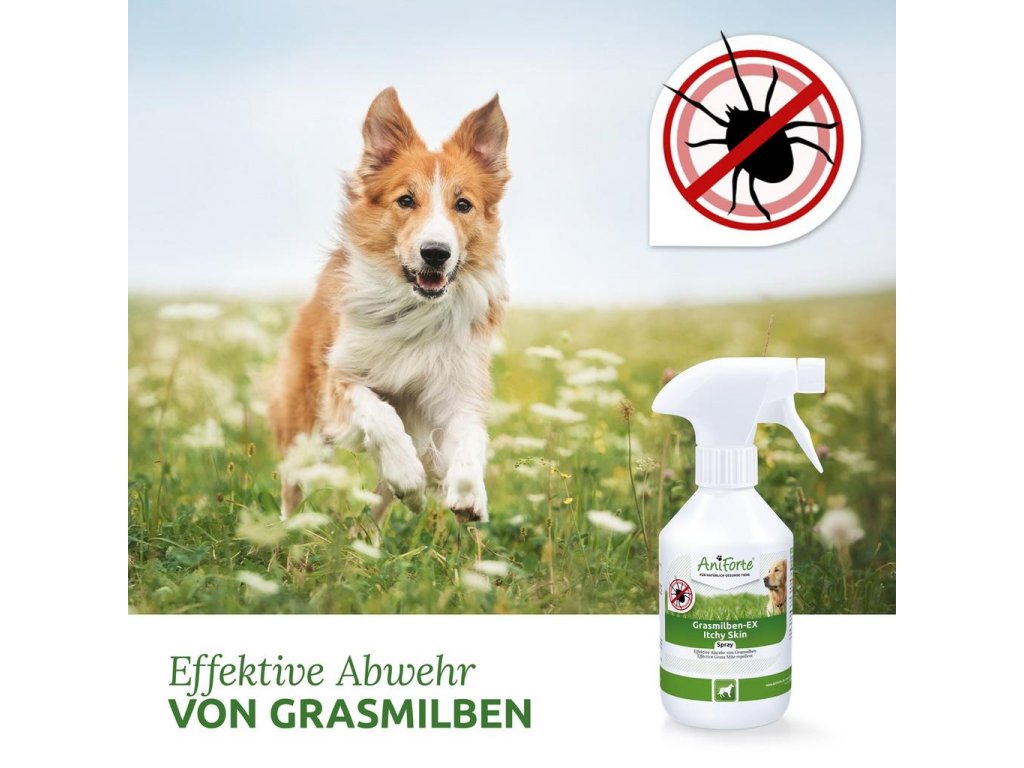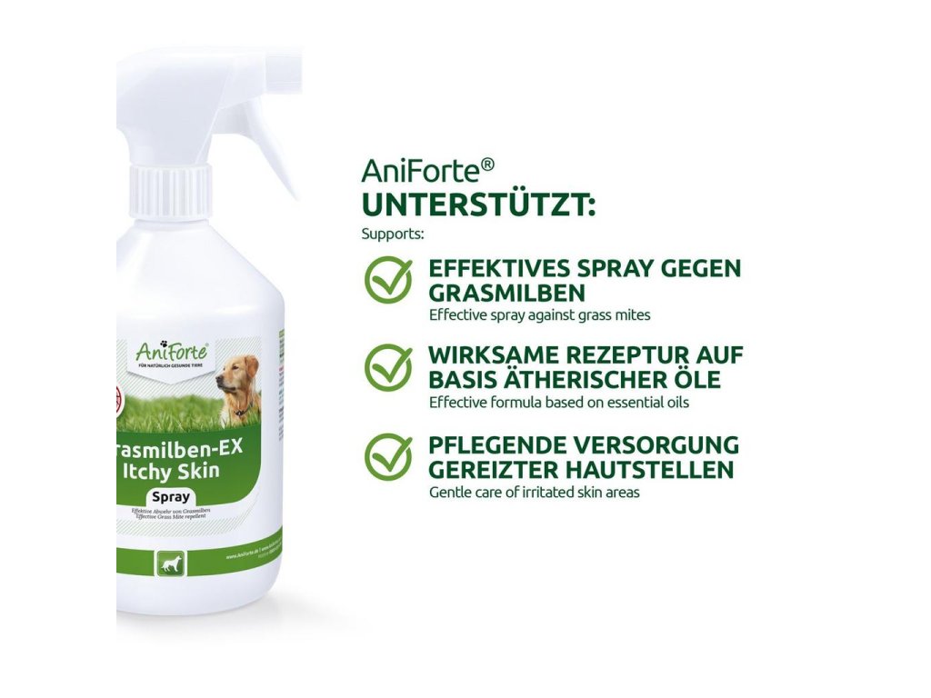 AniForte® Mite-STOP Spray je repelent, který podporuje obranu proti roztočům a parazitům. Roztoči a další ektoparazité se mohou vyskytovat u mladých i starších zvířat a způsobit podráždění kůže a svědění. Oslabený imunitní systém, nedostatek minerálů nebo metabolické problémy mohou zvýšit zamoření ektoparazity, tedy parazity, kteří infikují tělo zvenčí. Vybrané složky ve spreji AniForte® proti roztočům přispívají k ochrannému štítu. Kromě toho lék pomáhá omezit šíření parazitů. Díky tomu je sprej na roztoče skutečným všestranným pomocníkem a lze jej použít na různá zvířata, jako jsou psi, kočky nebo koně.