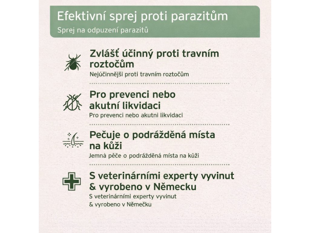 - Účinný sprej proti roztočům a parazitům
