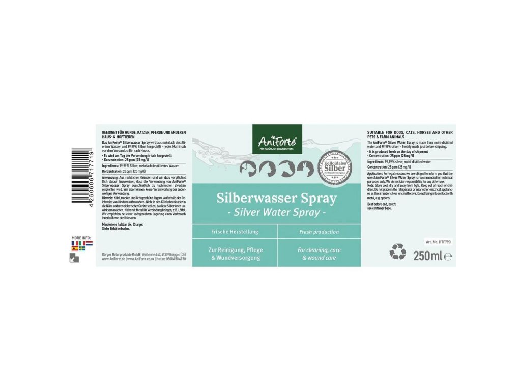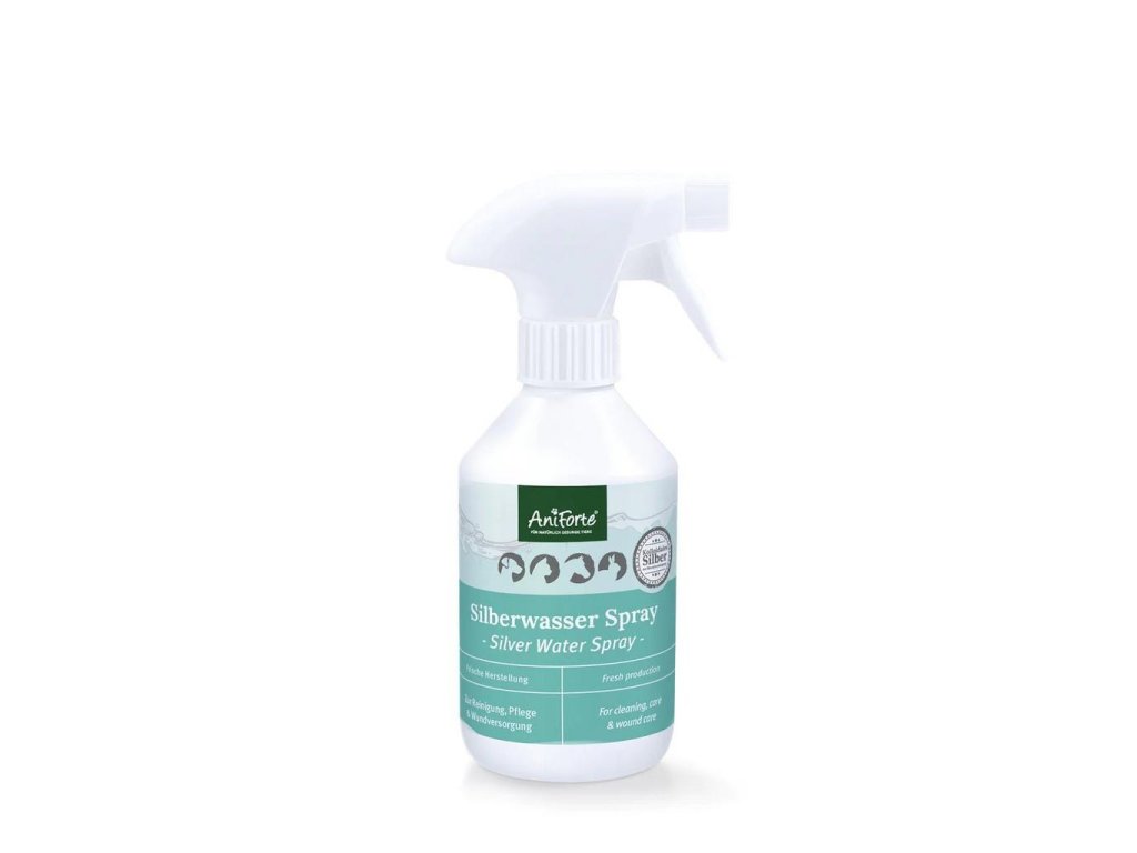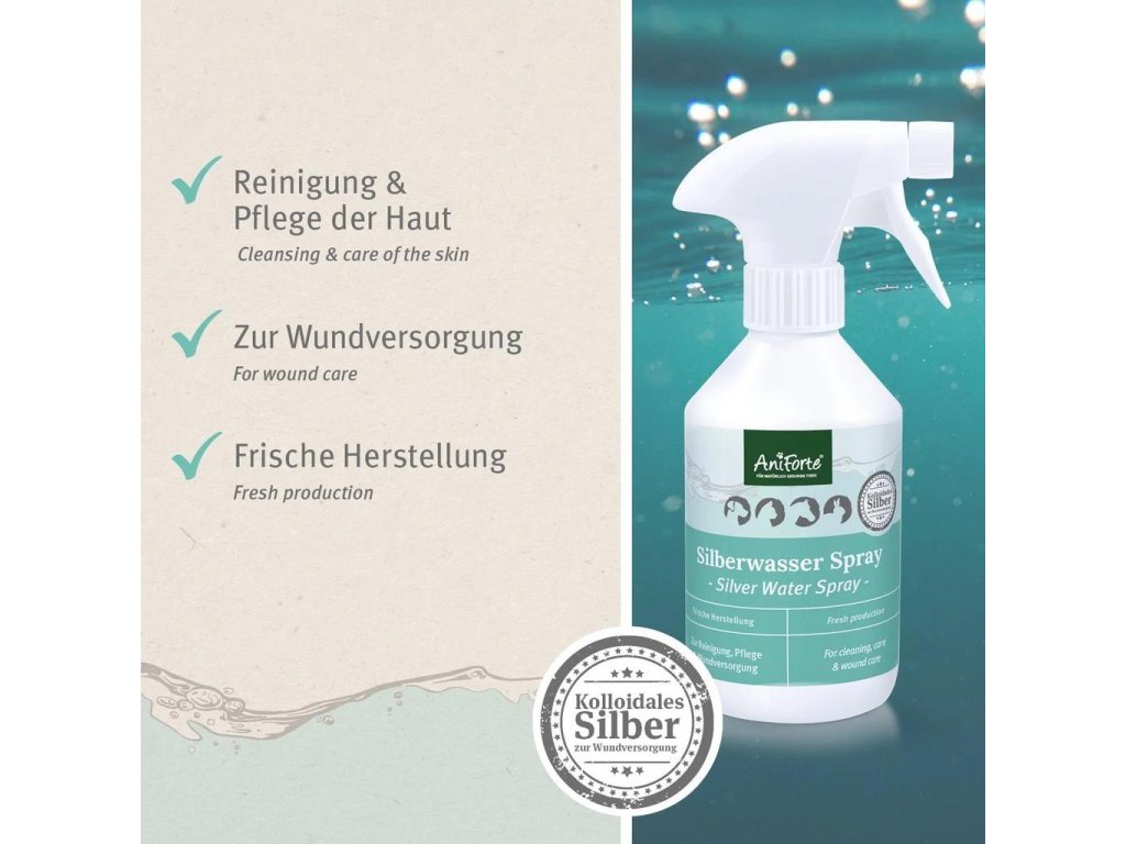 Stříbrná voda ve spreji AniForte® je vhodná k čištění a péči o kůži psů, koček, koní a dalších hospodářských zvířat a domácích mazlíčků. Vzhledem k antimikrobiální účinnosti nanostříbra je stříbrná voda doporučována pro péči o pokožku a péči o rány. Stříbrná voda ve spreji AniForte® je pro vás v den expedice vždy čerstvá z 99,99% stříbra a opakovaně destilované vody.