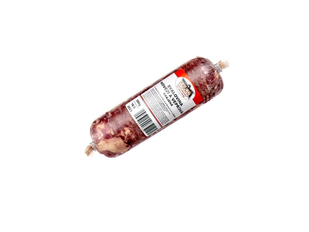 Obsahuje 50 % hovězí svaloviny a 50 % vepřové svaloviny. Vše obsažené v cca 300g balení. Salám je balen ve varném střevě, proto je možné vařit i s obalem.