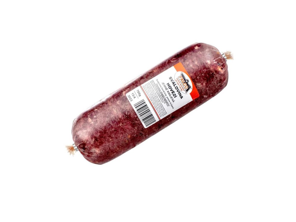 Obsahuje 100 % hovězí svaloviny. Navíc je pokrájen na menší kousky, což je například vhodné pro štěňata nebo malá plemena, ale také seniory. Vše obsažené v cca 700g balení. Salám je balen ve varném střevě, proto je možné vařit i s obalem.