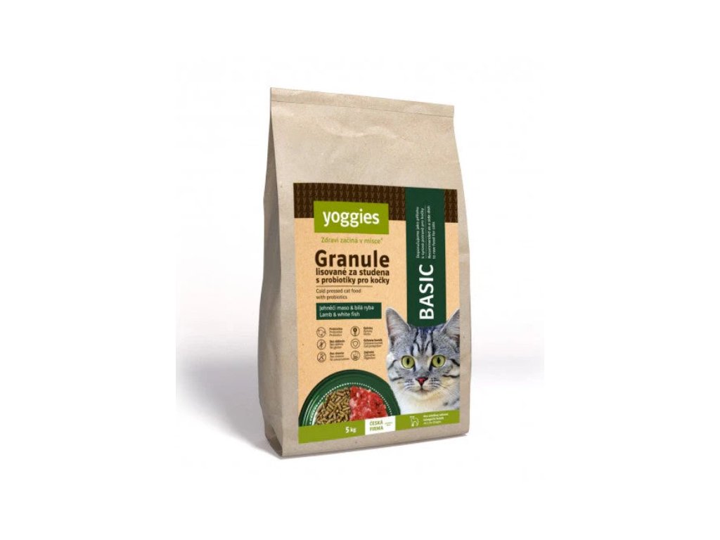 Yoggies Cat "Basic" jsou první a nejdietnější formou granulí lisovaných za studena pro kočky z dílny Yoggies. Jsou alternativou hlavně pro kočky krmené masem (BARF) či případně doplňkem k němu.