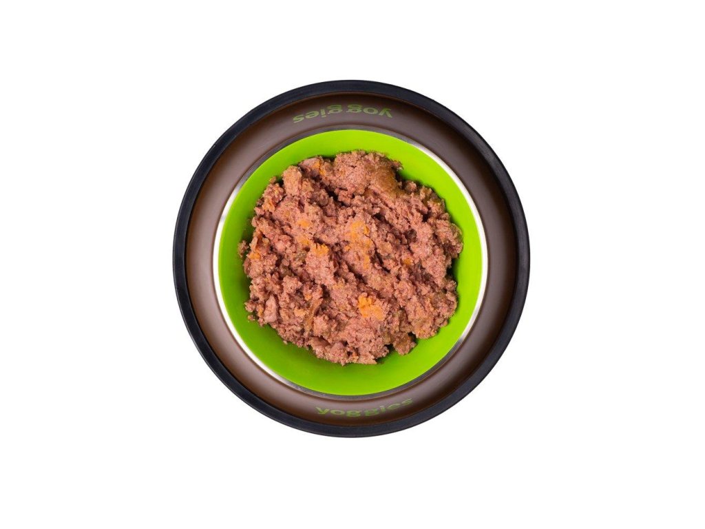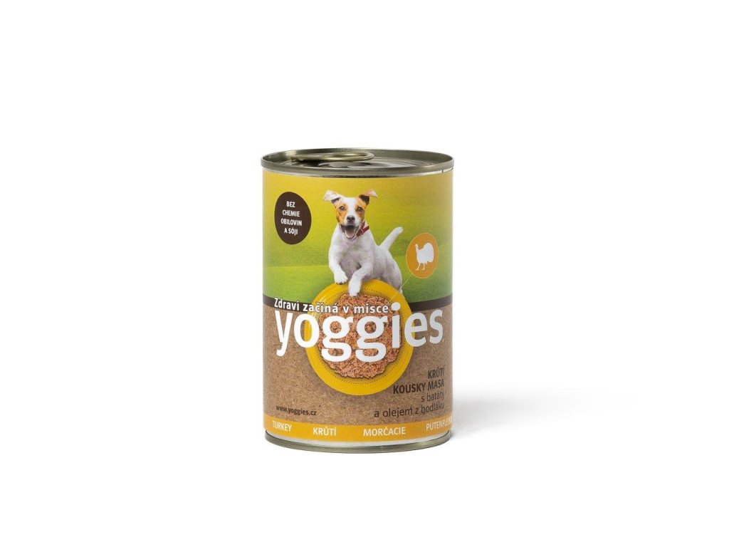 Konzerva Yoggies se špičkovým krůtím masem, čistou svalovinou, bez jakýchkoliv konzervantů a dochucovadel. Konzervy pro psy Yoggies obsahují výhradně kusy masa (větší i menší kousky), zeleninu (batáty-sladké brambory) jako zdroj vlákniny, přírodní vývar z masa a kostí (žádný bujón) a také olej z bodláků (světlice barvířská), který se používá např. na podporu buněčné stavby, nebo krvetvorbu a podporu trávení.