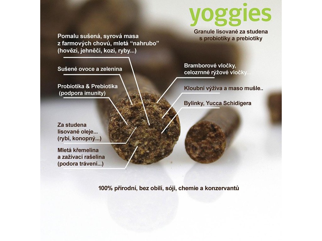 Za studena lisované granule Yoggies obsahují 84 % kvalitního masa před sušením – tzn. před ztrátou vody, která se v masu přirozeně vyskytuje. Po vysušení masa se tak objem zredukuje na cca 35-40 % celkové původní váhy. Probiotika v granulích podporují imunitu i zdravý trávicí trakt. Jsou výborně stravitelné a nebobtnají (potlačují riziko torze žaludku).