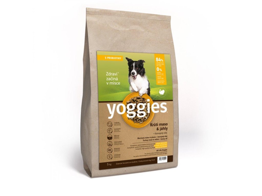 Za studena lisované granule Yoggies obsahují 84 % kvalitního masa před sušením – tzn. před ztrátou vody, která se v masu přirozeně vyskytuje. Po vysušení masa se tak objem zredukuje na cca 35-40 % celkové původní váhy. Probiotika v granulích podporují imunitu i zdravý trávicí trakt. Jsou výborně stravitelné a nebobtnají (potlačují riziko torze žaludku).
