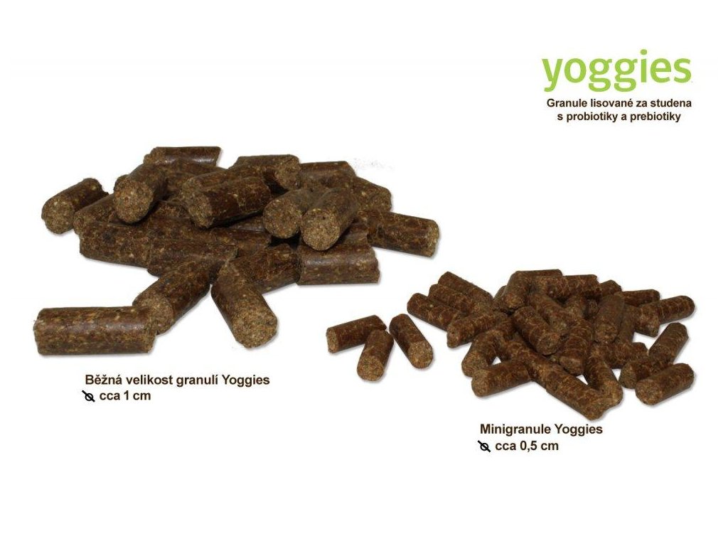 Za studena lisované granule Yoggies obsahují 84 % kvalitního masa před sušením – tzn. před ztrátou vody, která se v masu přirozeně vyskytuje. Po vysušení masa se tak objem zredukuje na cca 35-40 % celkové původní váhy. Probiotika v granulích podporují imunitu i zdravý trávicí trakt. Jsou výborně stravitelné a nebobtnají (potlačují riziko torze žaludku).