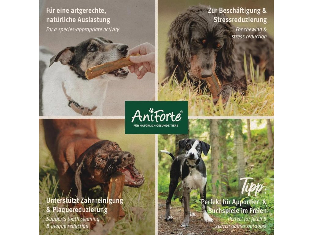 AniForte® žvýkací kost z olivového dřeva zajišťuje druhově vhodné využití, působí jako přírodní zubní kartáček a může podpořit péči o zuby vašeho psa.